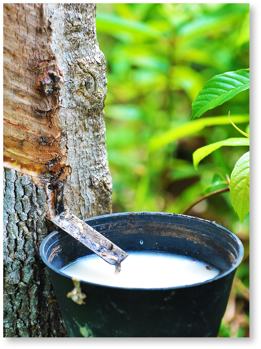 The tree “Hevea Brasiliensis” is the source of natural latex, the precursor for all subsequent rubber products. It thrives in tropical latitudes, especially in South and Southeast Asia, as well as in West Africa and Central America.
